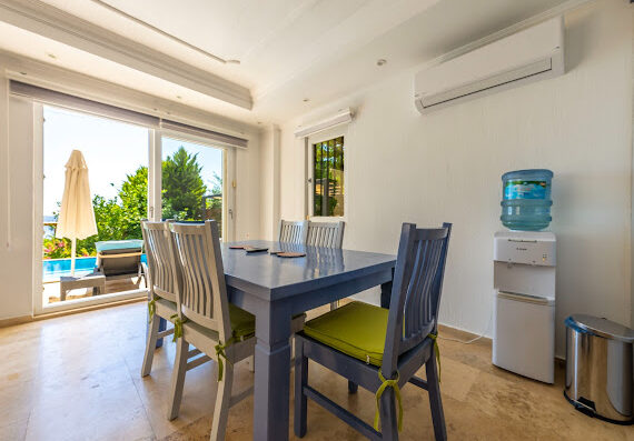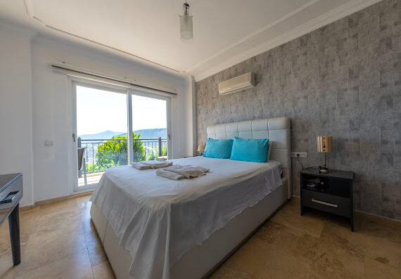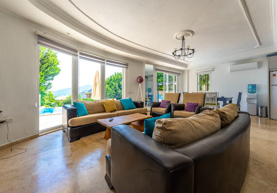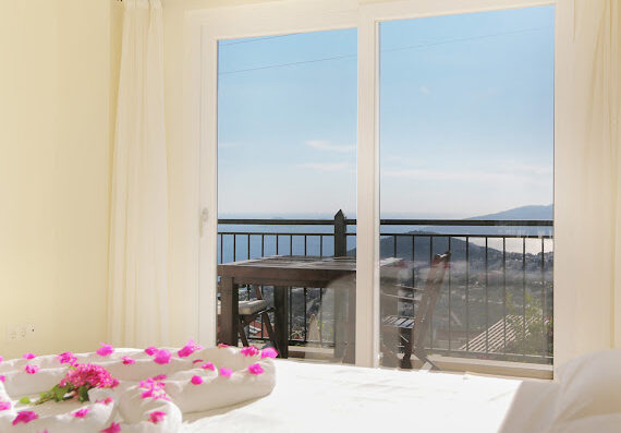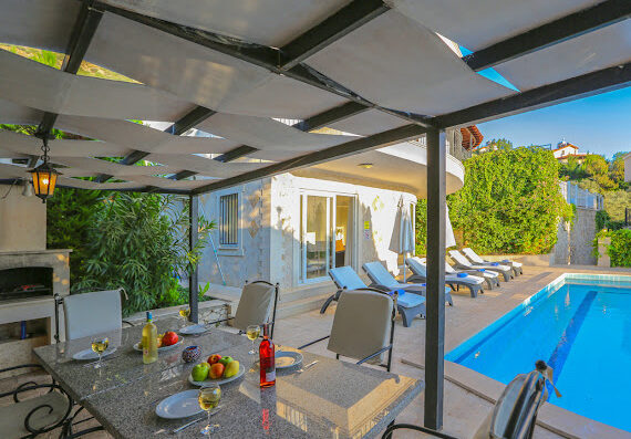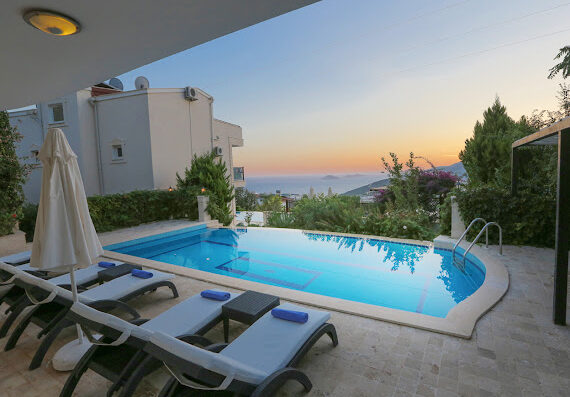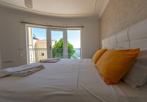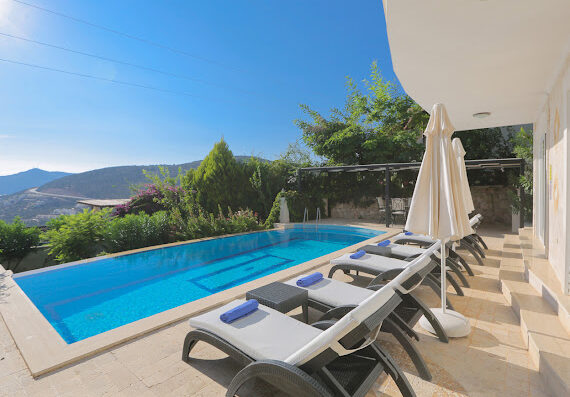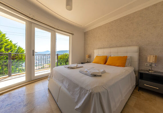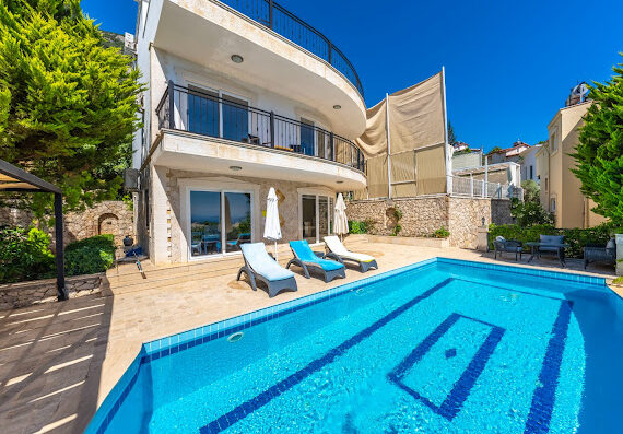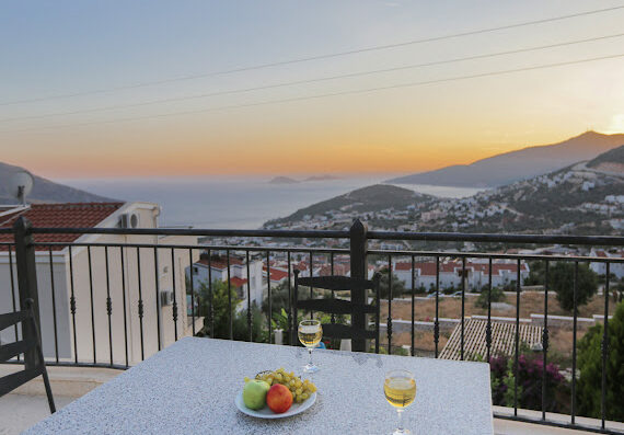 Situated in a quiet location, Villa Sarniç has views across the Taurus Mountains and Kalkan bay, yet it’s still within easy reach of Kalkan town, harbour and beach. There are sea views from all 3 levels, from the large 10 metre private pool and sun terrace with built-in BBQ, the large first floor balcony, and the roof terrace. Inside, this fully air-conditioned villa has 3 double bedrooms all with balconies or terrace access, 3 marble bathrooms, including a jacuzzi bath in the master en-suite, a fully-fitted granite kitchen, spacious lounge and laundry room. The villa accommodates six people comfortably, and is a short walk from a mini-market, greengrocers and traditional Turkish pancake house.