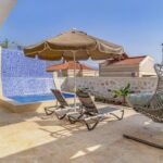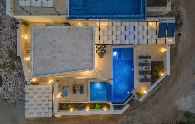 The first-floor level has a fresh water infinity pool with integral shallow area for children and Jacuzzi section with a seat. There is also a spouting water feature and one edge cascades into the small pool on the level below. The pool area has 4 sun loungers with a large umbrellas, with a great seating area in which to relax and admire the views.