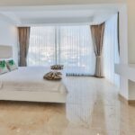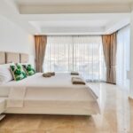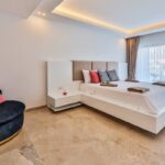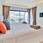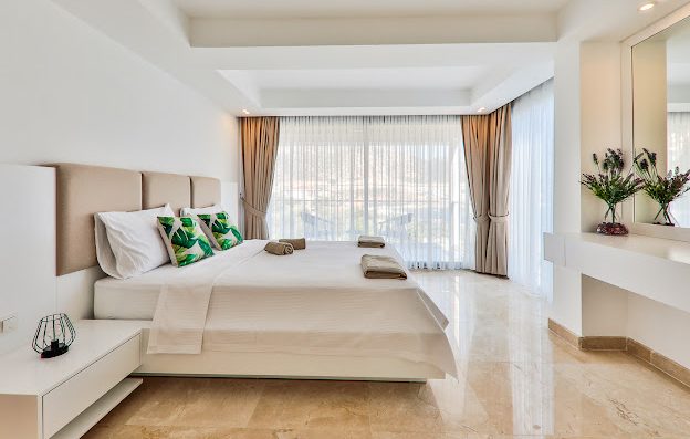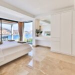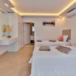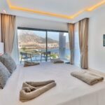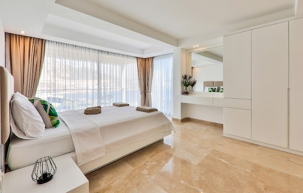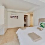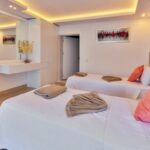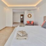 On the landing there is a door leading out onto a roof terrace that’s furnished with large pink cushions for seating. This terrace can also be accessed from the second bedroom on this floor.