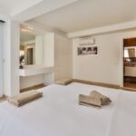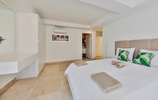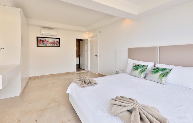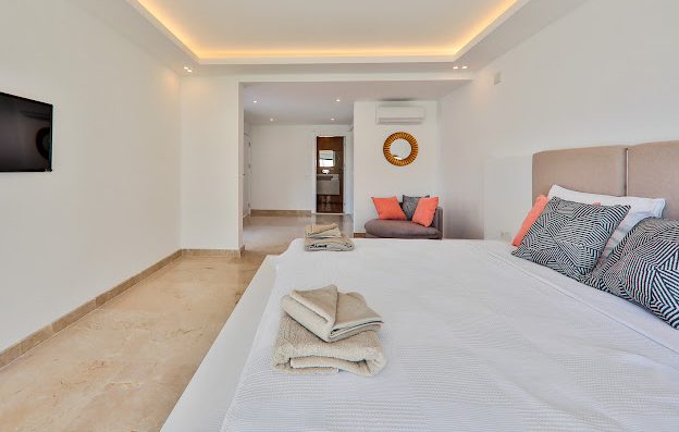 The floor has two double bedrooms – the first of these has an en-suite shower room and its own balcony with two chairs and a small table.