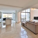 This level comprises an open plan living area with L-shaped sofa and flat-screen TV plus a large fully-fitted kitchen together with a dining area to seat 10 guests.