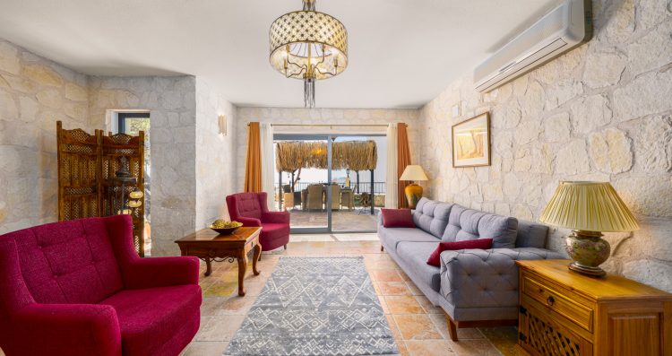 Patio doors from this level provide magnificent views over Kalkan Bay and these open out onto the pool terrace.