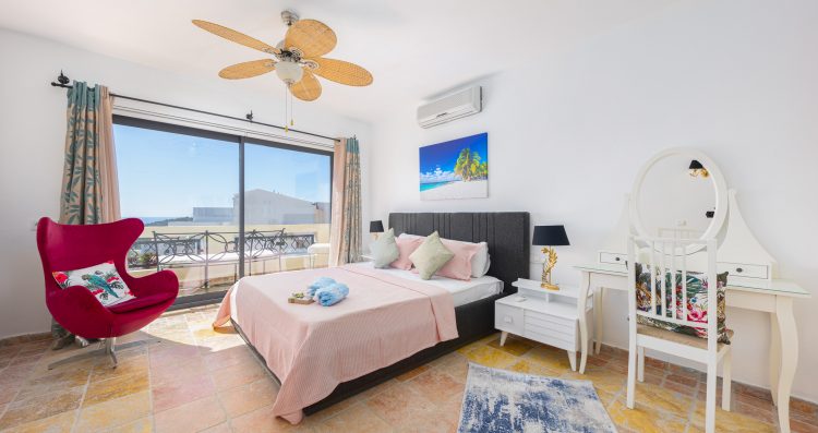 Large double bedroom with an en-suite facilities and spacious balcony with stunning sea views of Kalkan Bay .+TV