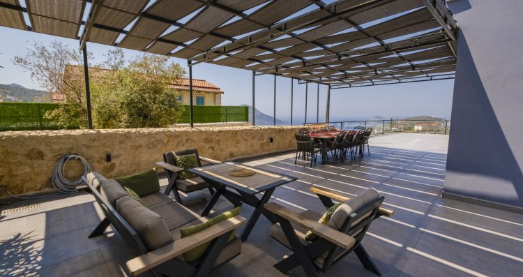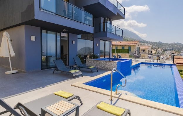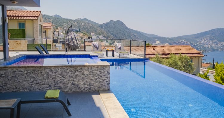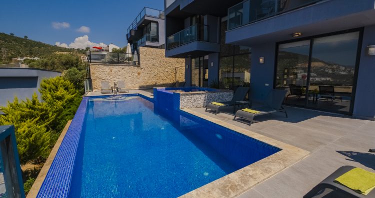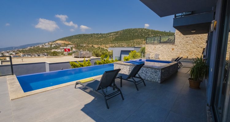 Villa Waterfall I is a striking building positioned at the top of Kalkan in the Kızıltaş area. The villa was named owing to the waterfall feature that has been incorporated into its design; flowing water cascades from the roof terrace down to the ground floor where it meets the large infinity pool.