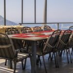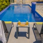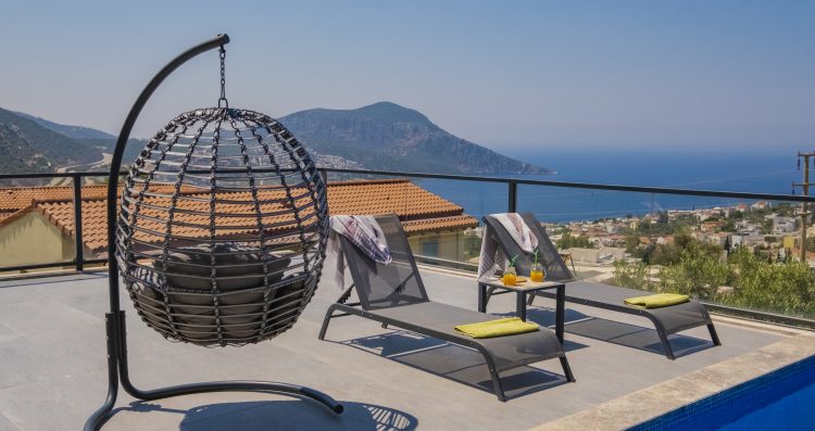 Large sliding doors open out onto a spacious pool terrace with an infinity pool. This terrace is ideal for enjoying a BBQ with wonderful sea and mountain views and ample space is provided for dining, soaking up the sun or lounging on the swing chair.