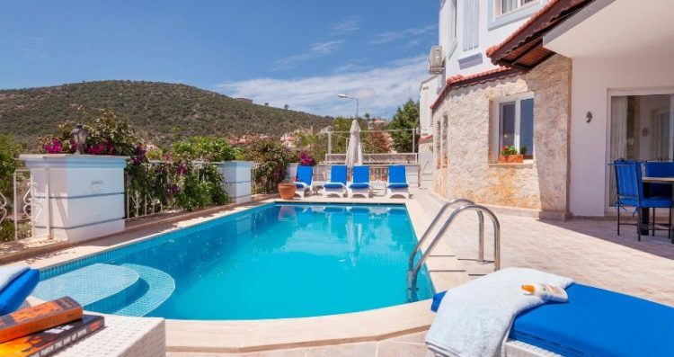 Outside Yaz Evi has a Private secluded pool area with terrace screened with attractive Turkish stone walls. The terrace is furnished with outdoor sofas area a shaded eating area with a table and 6chairs.
